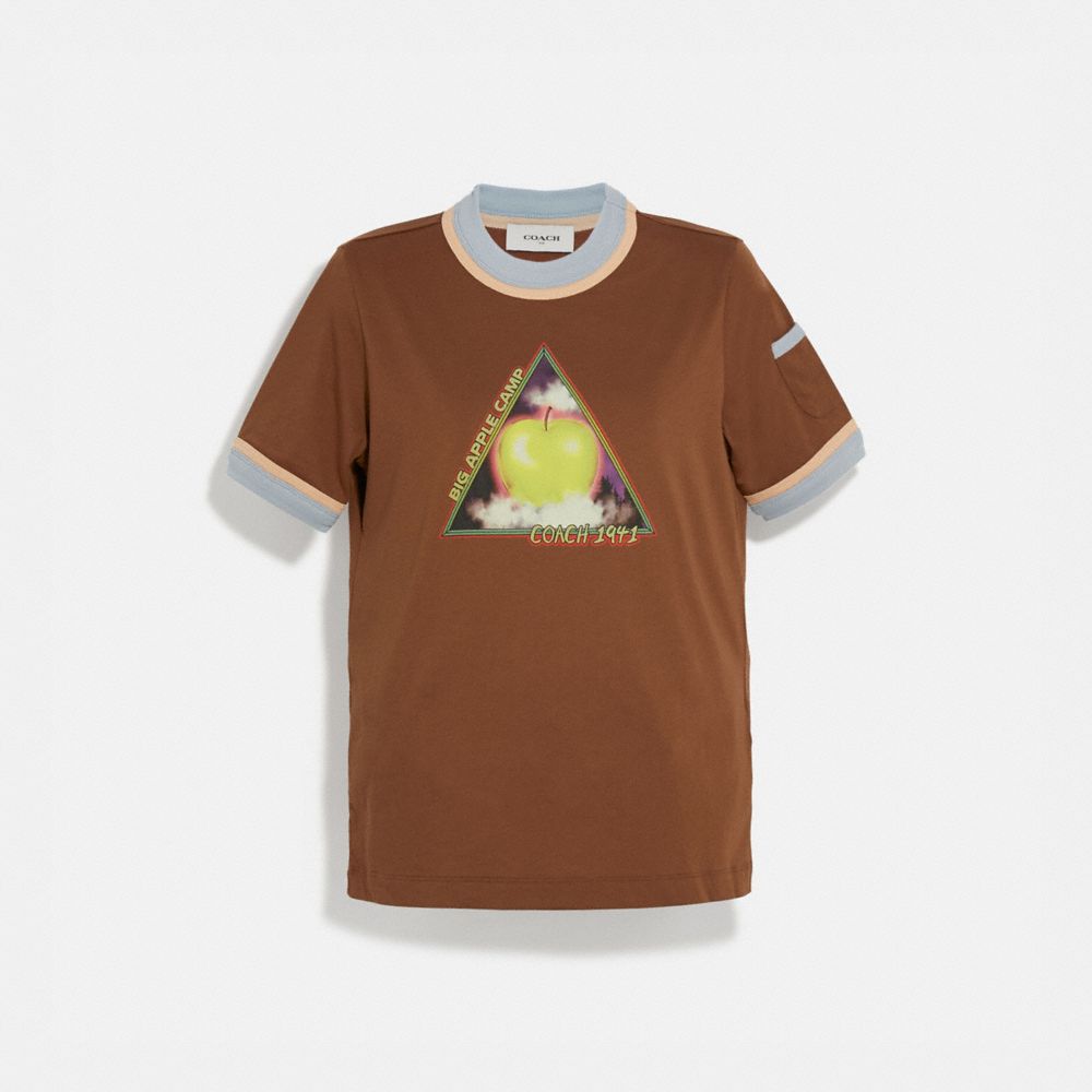 Join the Coach Big Apple Camp—where outdoor adventures meet New York City. Featuring a whimsical graphic inspired by classic campgrounds, this classic-fit 1970s-inspired T-shirt is crafted of soft cotton with contrast trim and a pocket detail at the sleeve.