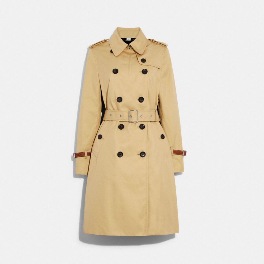 • A style icon for everyday, our classic-fit trench coat is crafted of a sturdy cotton-blend. In a nod to our heritage, the double-breasted silhouette is finished with leather bracelets at the cuff.